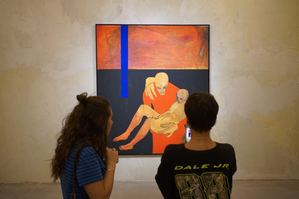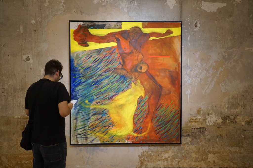 En su texto de sala, Gabriel Ventura evoca la figura de los buitres hambrientos: metáfora inquietante de cómo nos alimentamos de lo que miramos, caníbales de la propia fuerza visual de las imágenes. Una de las pinturas muestra una figura con túnica roja, sostenida en su fragilidad, que parece hablarnos de la escoria, de la carne entregada en aquel lugar donde los buitres descienden a alimentarse. El eco de las culturas tibetanas resuena aquí: en ellas, los cuerpos de los muertos son dejados a merced de las aves rapaces, en un gesto de retorno absoluto a lo sagrado.